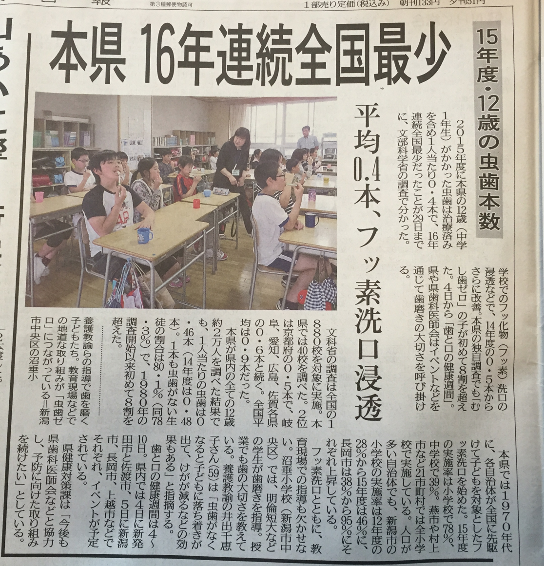 新潟県が今年も12歳児の永久歯のむし歯本数が、16年連続で全国最小となったことが新潟日報の記事として取り上げられていました。