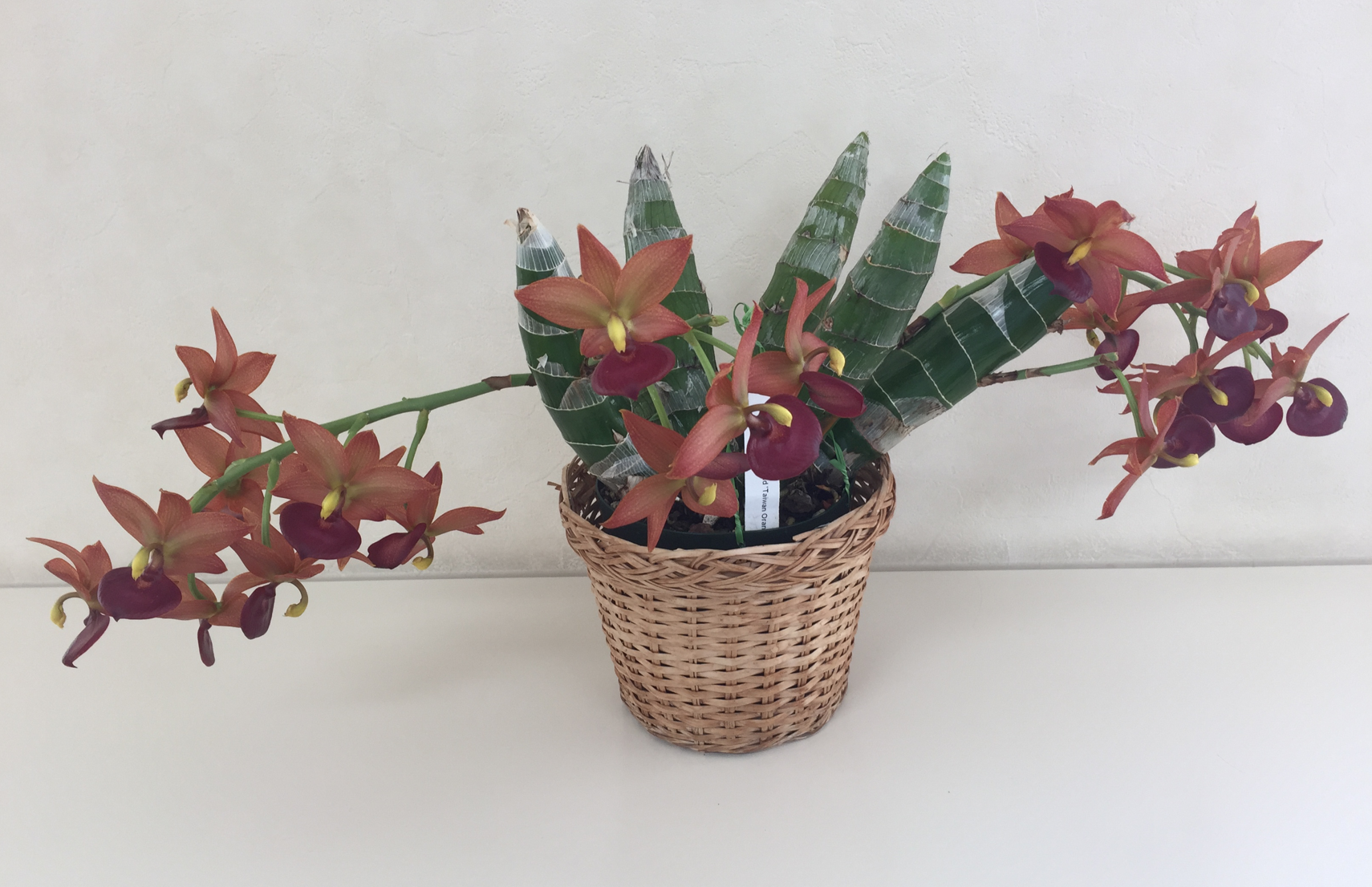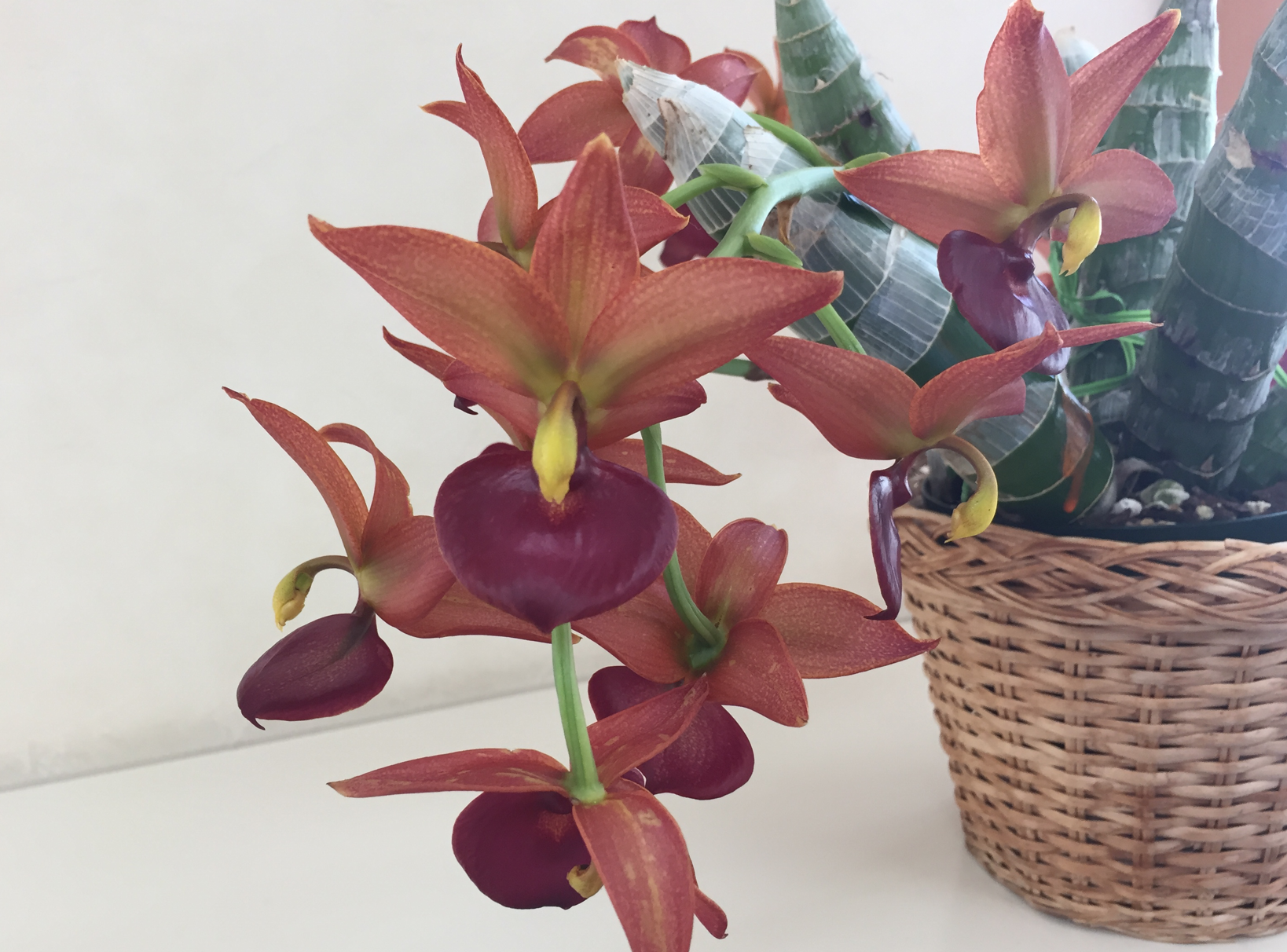 今年はバルブも増え、花芽も6本ほど上がりましたが、預かっていただいている温室で野ネズミに花芽を食べられ、結局4本の花芽が育ち開花しました。
