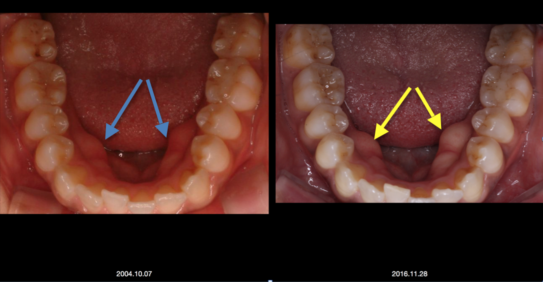 2016年に来院された時に撮影していたお口の中の写真を12年前の写真と比較すると、下顎の内側の骨の隆起が大きくなって発達してきています。これは噛み締めの習慣のある患者さんによく見られる現象です。