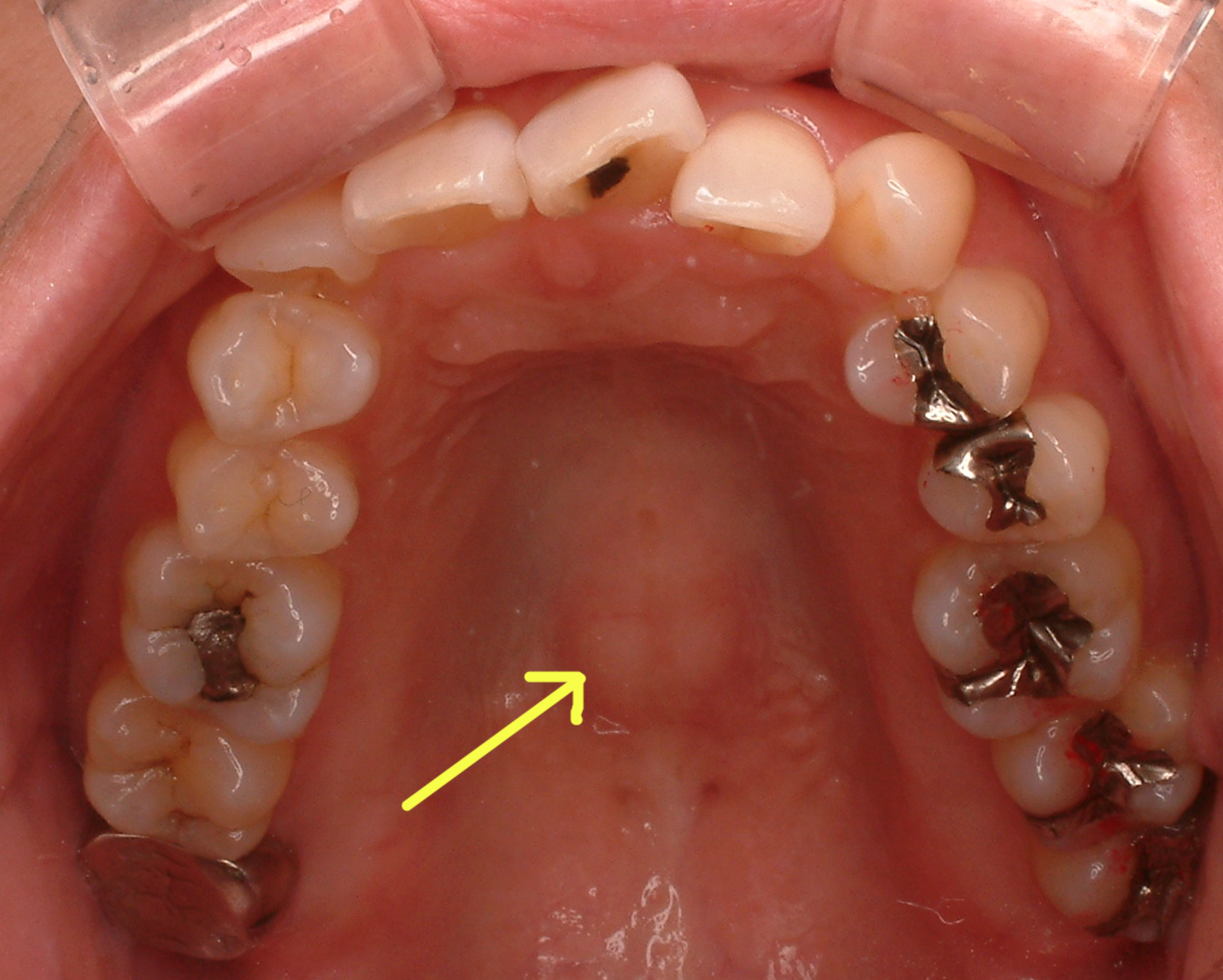 その他骨のところに現れるサインでは、上の顎の内側の真ん中が盛り上がってくることもあります。