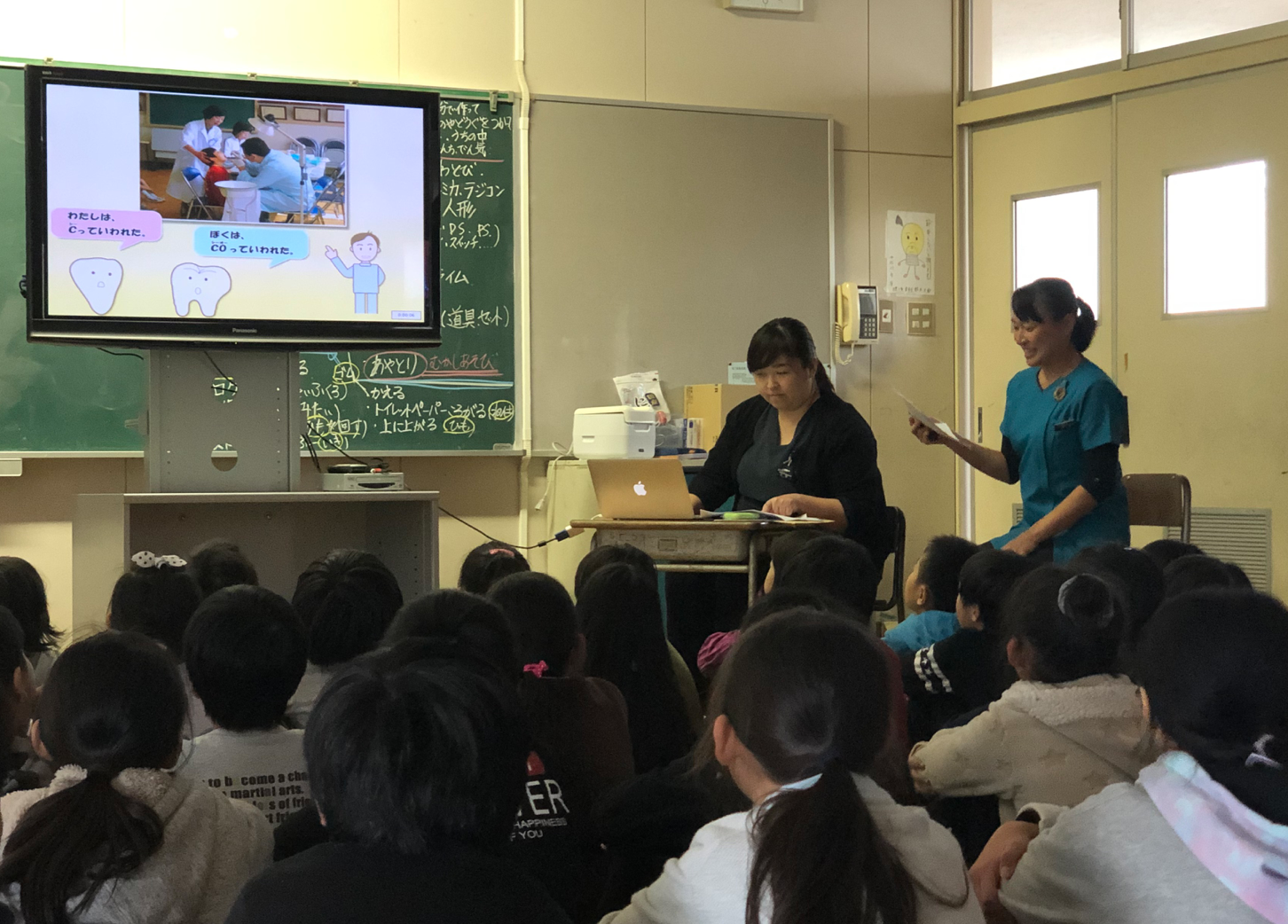 先日、新潟市秋葉区の小須戸小学校2年生の皆さんへブラッシング指導に行って参りました。前半は『むし歯予防大作戦!』と銘打って、むし歯予防のお話や6歳臼歯の磨き方のお話をしました。