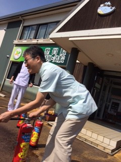 二階の湯沸室が出火という想定でした。無事全員が外に出たあと人数を確認し、水消化器を使って消火訓練をしました。皆、真剣な表情です。
