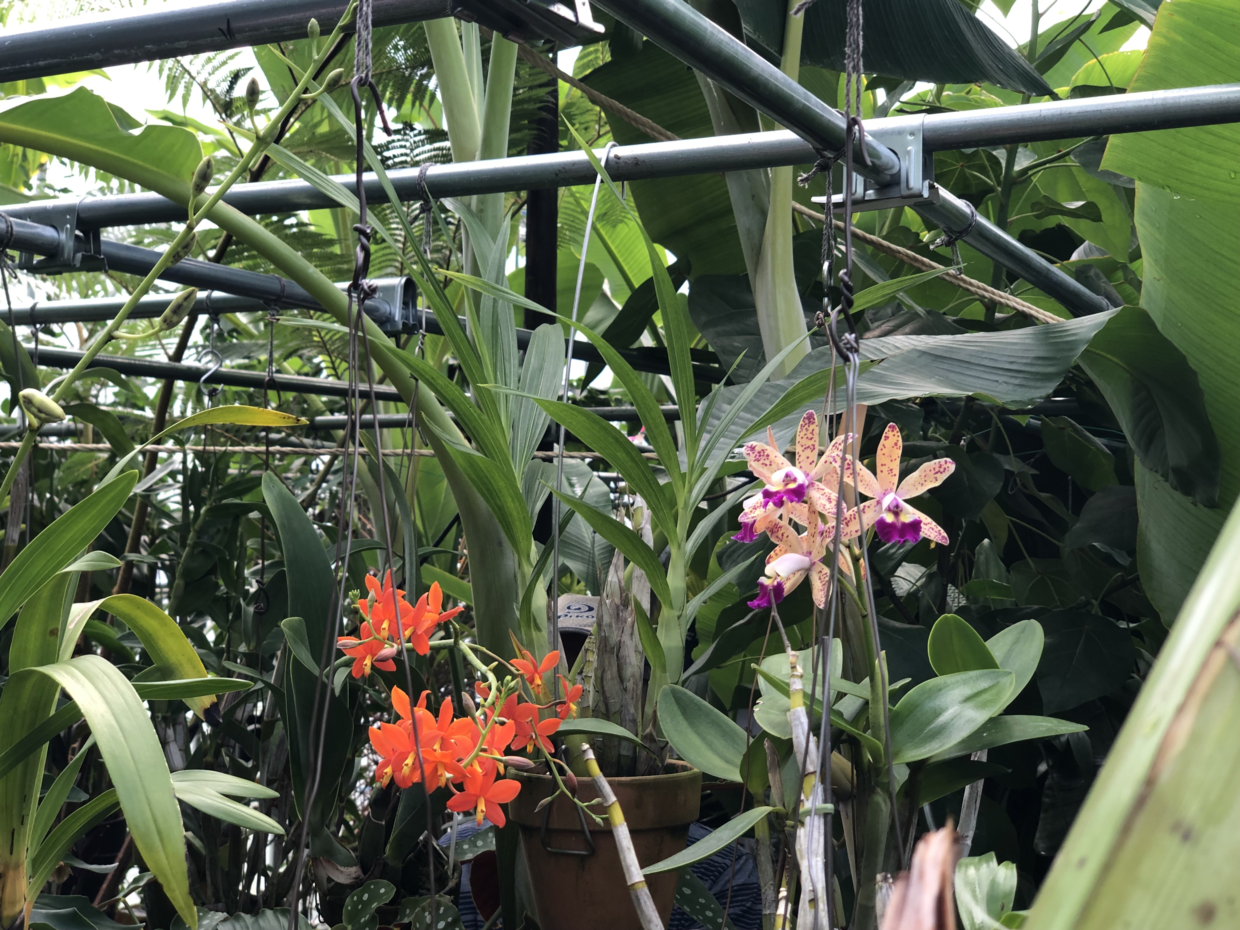 バナナの間に蘭を吊るして栽培。湿度も90%以上。蘭にも理想的な栽培環境です。