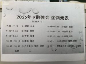 2025年10月の記事 勉強会 2025/10/06 先月、勉強会がありました。 年に数回行っており、今回のテーマは歯周病です。 それぞれ担当患者さんの治療経過や治療成果をまとめ発表、ディスカッションを行います。 新たな気づきなど参考になることも多く、とても有意義な時間となりました(^ ^) 今後もより良い治療が提供できるよう、日々勉強に励んでいきたいと思っています!