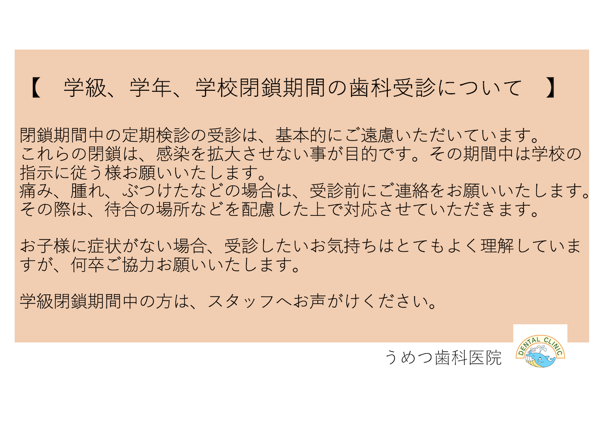 閉鎖期間中の定期検診の受診は、基本的にご遠慮いただいています。