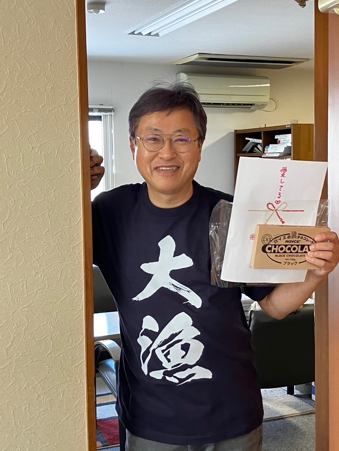 多趣味な院長ですが、釣りもそのひとつ! そんな院長へチョコレートと大漁Tシャツをプレゼント♪ 早速満面の笑みで着てくださいました!